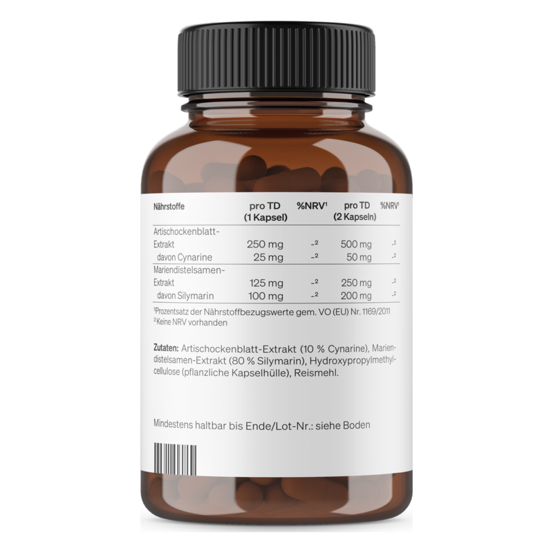 Braune Flasche mit Kapseln, Nährstoffangaben für Artischocken- und Mariendistelessenz auf dem Etikett.