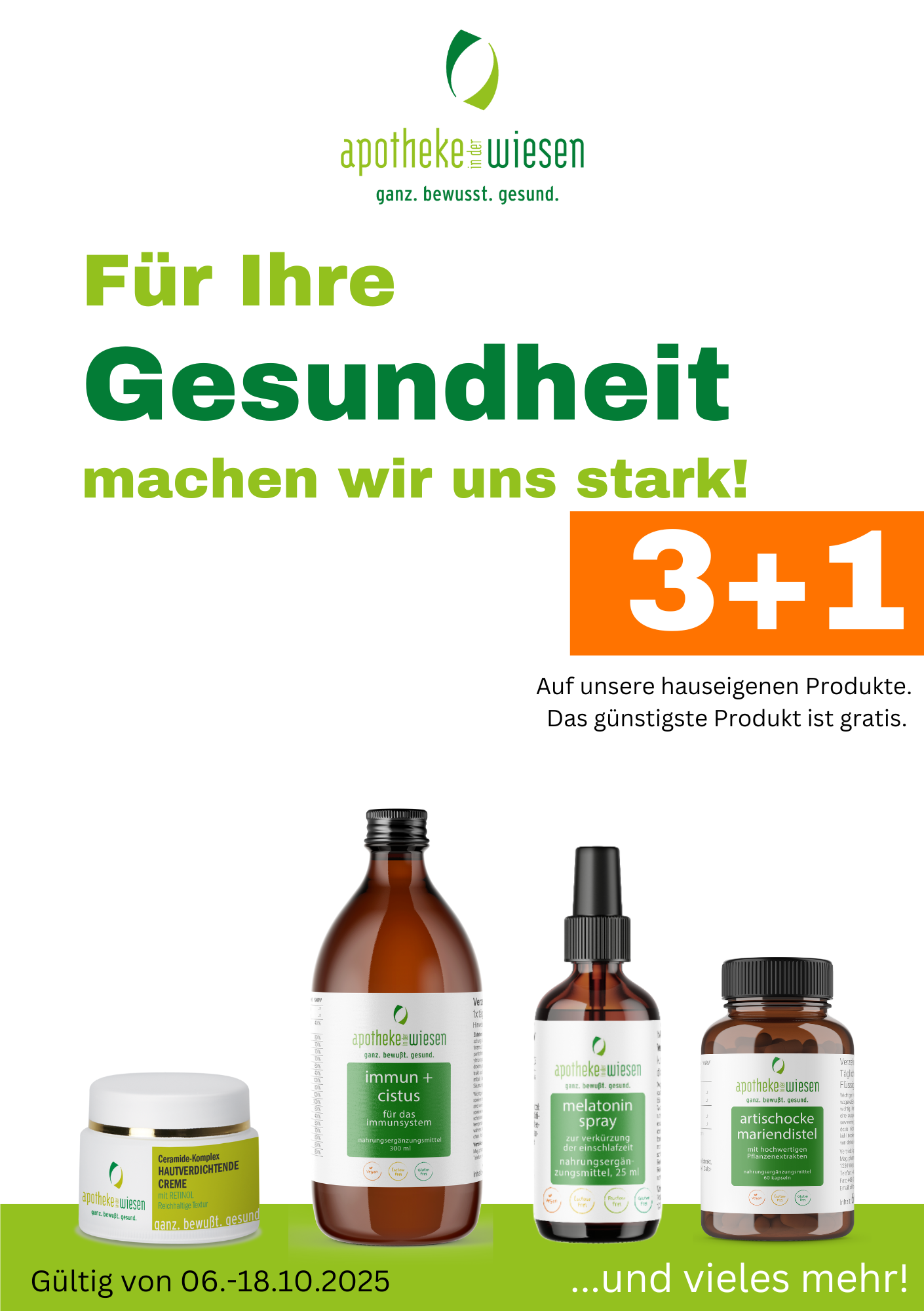 Werbung der Apotheke in der Wiesen. Text: "Für Ihre Gesundheit machen wir uns stark! 3+1 – Auf unsere hauseigenen Produkte. Das günstigste Produkt ist gratis. Gültig vom 06.10. bis 18.10.2025." Abgebildet sind verschiedene Produkte: eine Creme, eine Flasche ‚Immun + Cistus‘, ein Melatonin-Spray und Artischocken-Mariendistel-Kapseln.