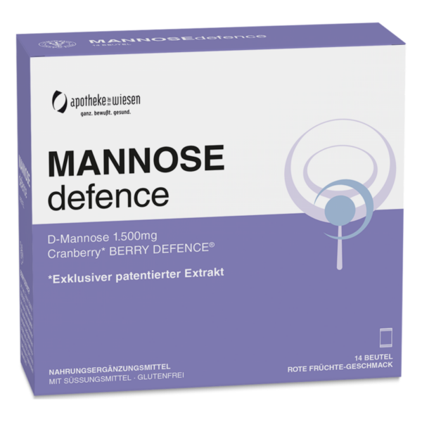 Nahrungsergänzungsmittel als lösliches Trinkpulver mit Süßungsmittel auf der Basis von D-Mannose, Cranberry Berry Defence® und Vitamin C. Patentanmeldung eingereicht.